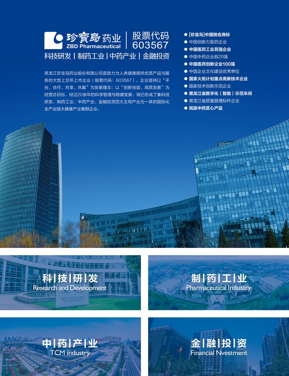 黑龍江珍寶島藥業(yè)股份有限公司(603567.SH)創(chuàng)立于1996年。公司以“為世界提供優(yōu)質(zhì)健康產(chǎn)品與服務(wù)”為企業(yè)使命,以“平臺 合作 共享 共贏”為發(fā)展理念,堅持“一心三園四平臺”發(fā)展戰(zhàn)略,以“六位一體”運(yùn)營模式推動企業(yè)經(jīng)營轉(zhuǎn)型。打造醫(yī)藥行業(yè)新質(zhì)生產(chǎn)力的重要平臺,加快科技研發(fā)成果轉(zhuǎn)化與應(yīng)用,積極參與國家醫(yī)藥產(chǎn)業(yè)項目建設(shè)。珍寶島藥業(yè)長期穩(wěn)居中國醫(yī)藥工業(yè)百強(qiáng)、中國中藥企業(yè)前二十強(qiáng)行列。業(yè)務(wù)領(lǐng)域涉及科技研發(fā)、制藥工業(yè)、中藥產(chǎn)業(yè)、金融投資四大板塊。